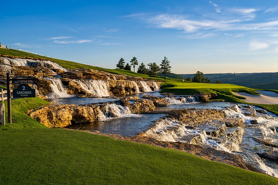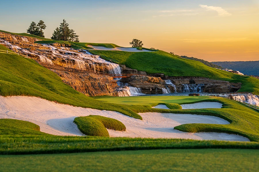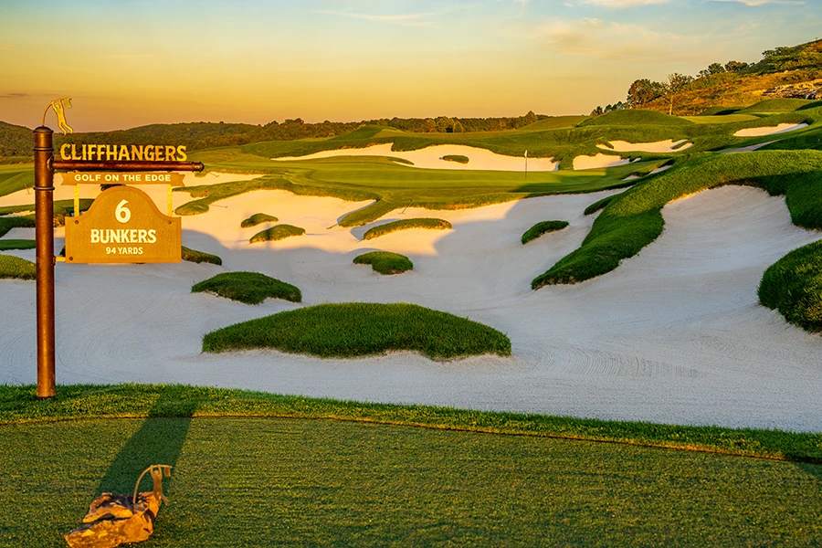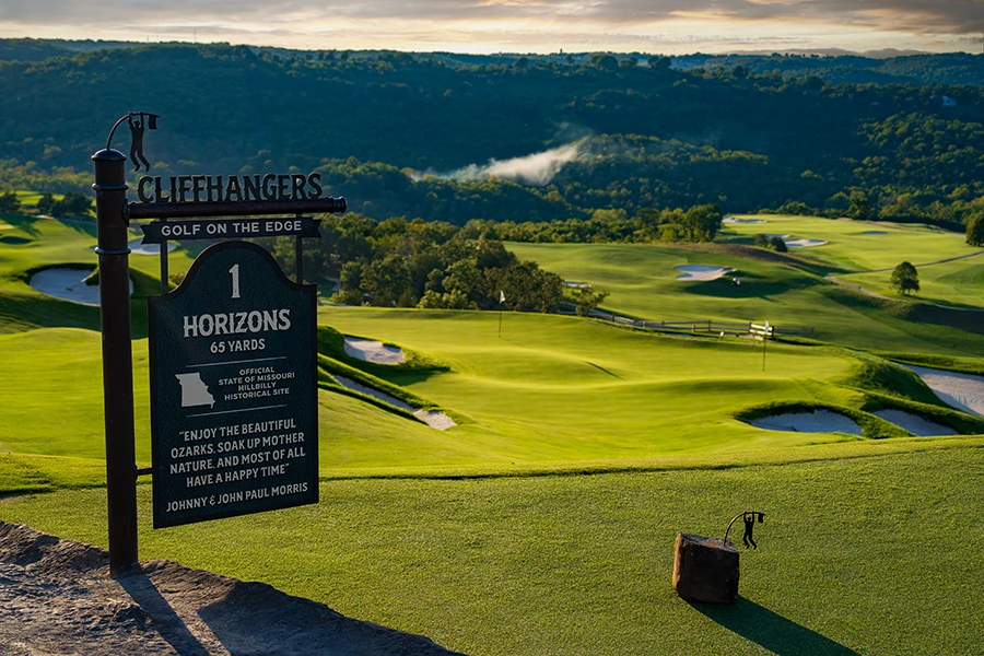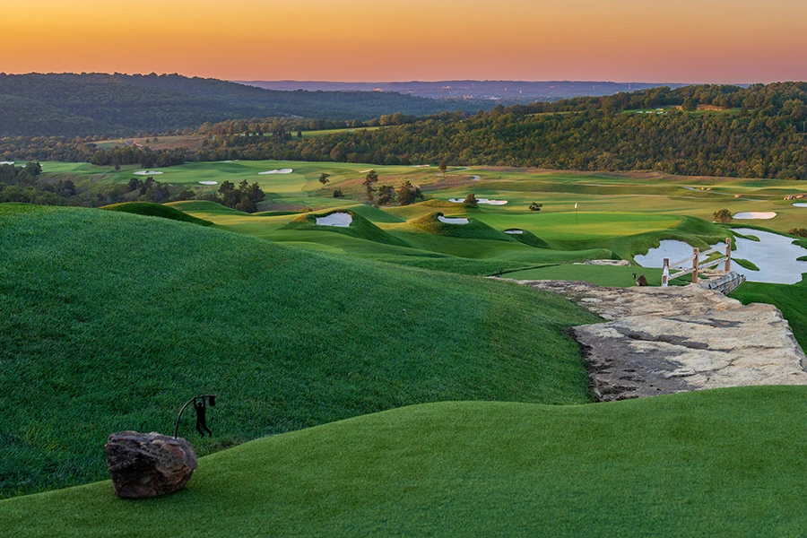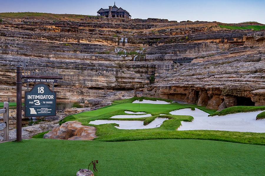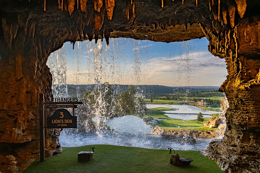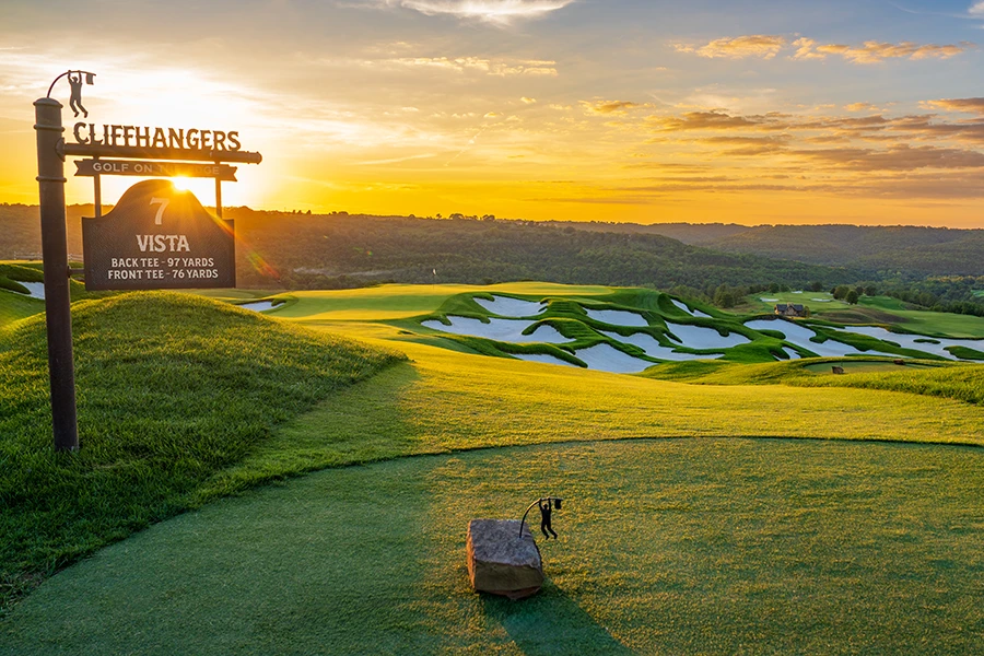 The Ozarks National Practice Facility is accessible for guests playing on Ozarks National, Payne’s Valley, Top of the Rock, Cliffhangers and Mountain Top. The practice area features two putting greens, a three-green short game area with sand bunkers, and a driving range featuring Zoysia Grass and artificial hitting surfaces. To prepare your game for the challenge of Ozarks National, the greens are all situated above or below the hitting area, similar to what you will see out on the course.